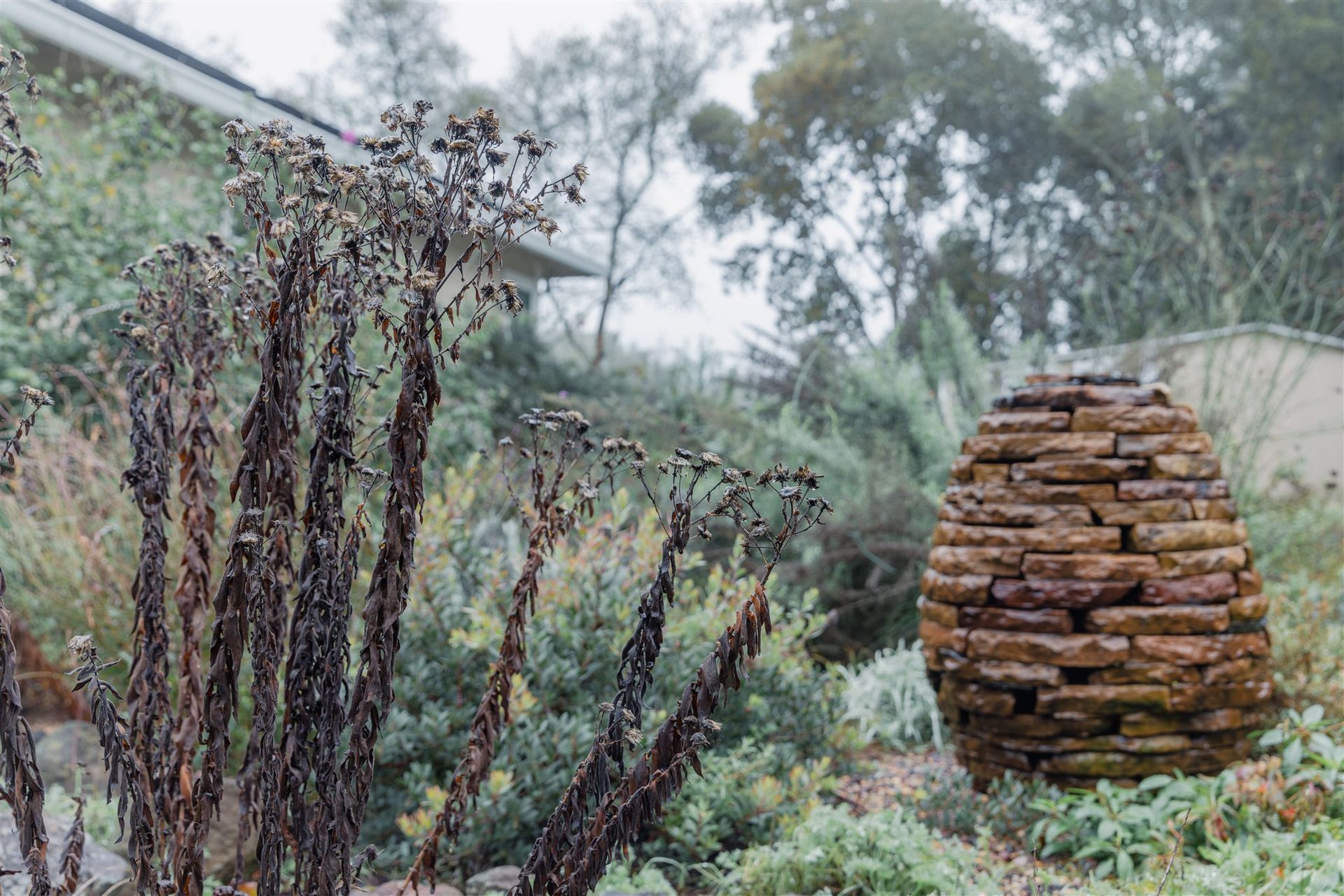 Dry stacked stonework is done without the use of mortar or glue to bind the rocks. Carefully selected stones are knitted together using a time-tested technique that forms an interlocking, load bearing structure that can last for hundreds of years. Unique and well-crafted stone structures bring combined beauty and durability to an ecologically designed garden.